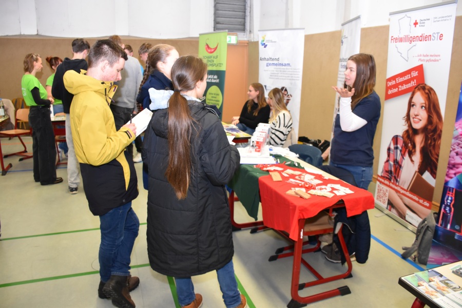 Im Jahrgang 11 lag der Schwerpunkt auf einer Berufs- und Studienorientierung. In einer BSO-Messe mit 25 Ständen erhielten die Interessierten direkte Kontakte zu Hochschulen und Institutionen. Ergänzt wurde die Messe durch Vorträge und Workshops, unter anderem zu Studiengängen an der Martin-Luther-Universität, zum wissenschaftlichen Arbeiten, zu Studienangeboten der HTWK Leipzig sowie zum Projekt "Schule &Steuern" in Zusammenarbeit mit dem Finanzamt Bitterfeld.